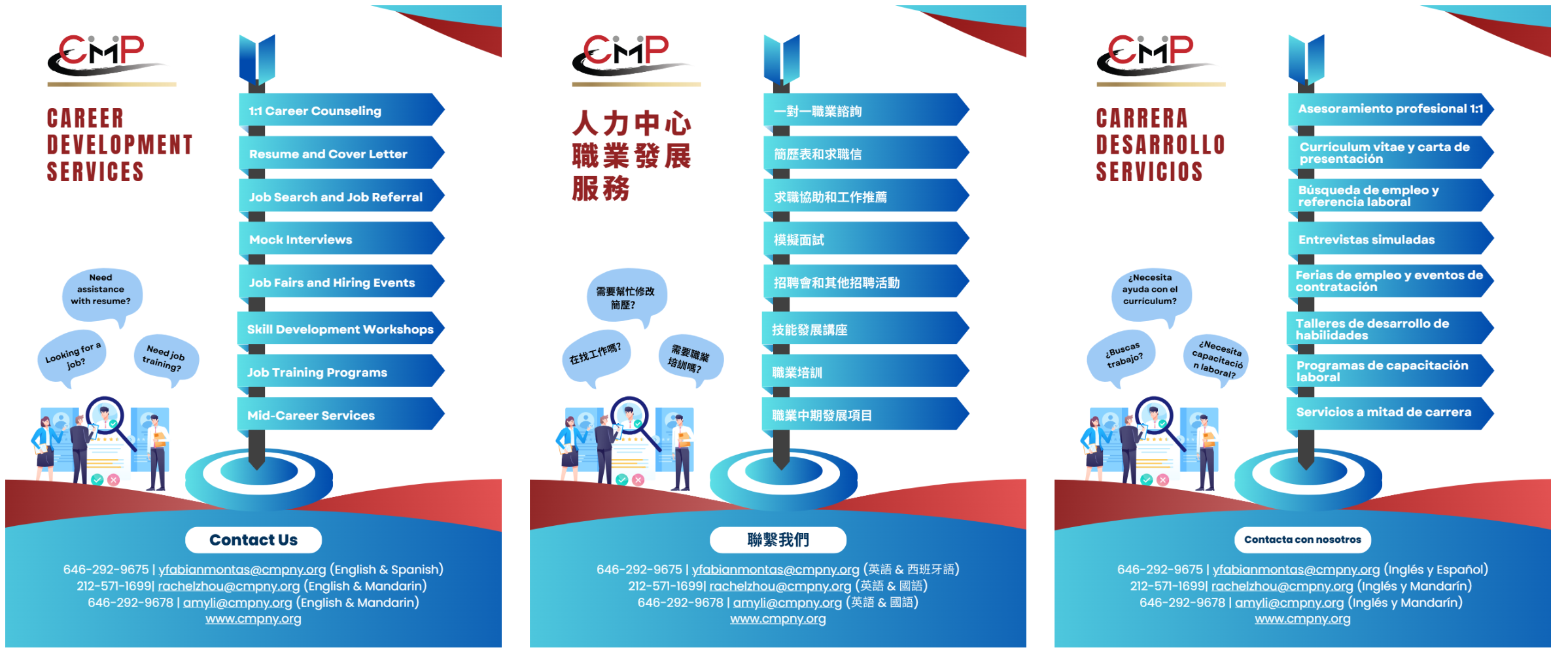 In addition to skills training, CMP also offers Direct Job Placement through walk-in services, annual job fairs, and recruitment events. In addition to local businesses, we featured noted employers such as TD Bank, Con-Edison, Allure Group, Spectrum, and United Healthcare, to name a few. In addition, CMP has worked with major employers to hold targeted recruitment events. Our recruitment partners included Bloomingdale’s, Coach, McDonald’s, NYC Department of Sanitation, etc.